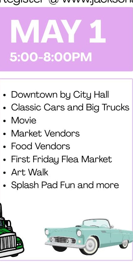 Join us for a fun, family-friendly night out in downtown Jackson on the first Friday of the month, May through August. Each month brings a different theme with something for everyone—food trucks, vendors, flea market, music, and community fun that gets you out and enjoying our town together.Images